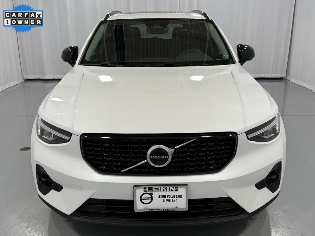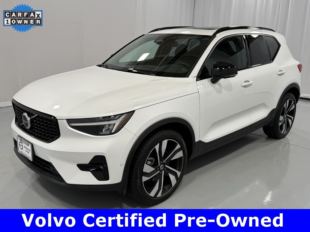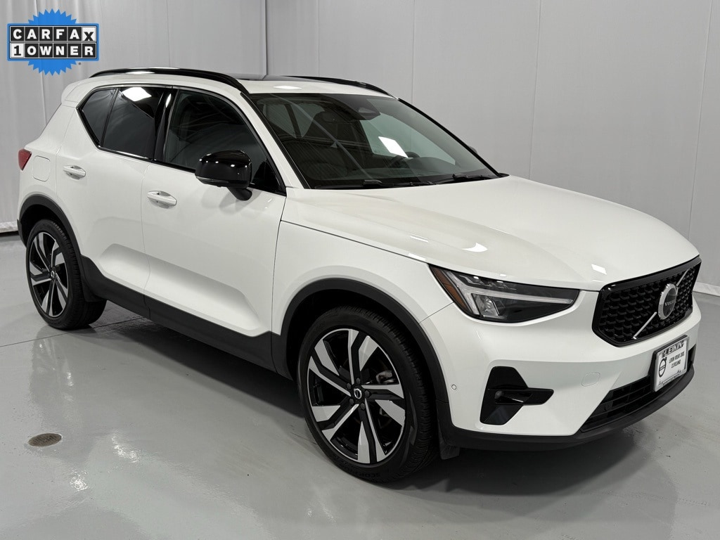 This Certified Pre-Owned 2025 Volvo XC40 B5 Plus Dark AWD is Crystal White Metallic with Charcoal Leather seats. It is equipped with the 360 Surround View Camera, Laminated Panoramic Moonroof with Power Sunshade, Front/Rear/Side Park Assist, 20" 5-Double Spoke Black Diamond Cut Alloy Wheels, HomeLink, Blind Spot Information System (BLIS), Heated Front Seats, Apple CarPlay Compatibility, Lane Keeping Aid, Air Purifier, and much more!